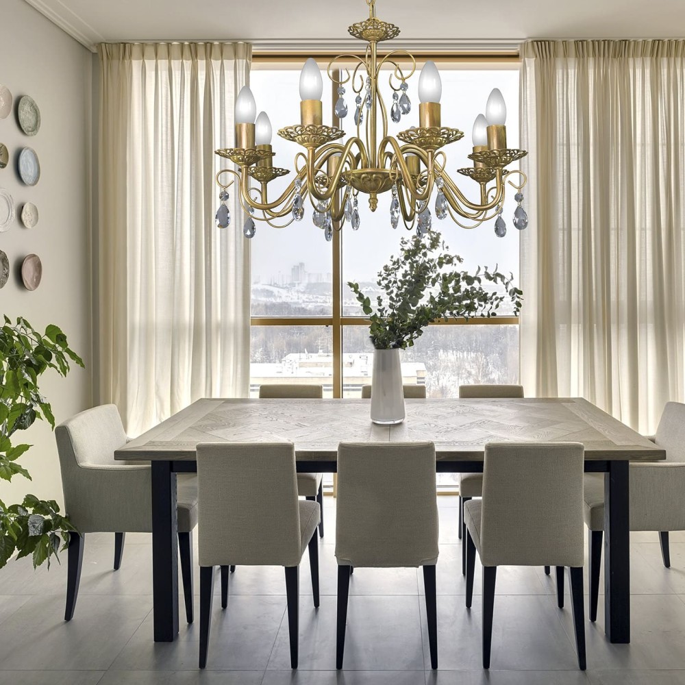 Подвесная люстра Аврора S1195-8 – Элегантное сияние для вашего дома Погрузитесь в мир роскоши и изысканности с подвесной люстрой Аврора S1195-8 от бренда ПЕТРАСВЕТ. Эта великолепная люстра, сочетающая в себе классический стиль, неоклассическую элегантность и очарование прованса, станет настоящим украшением вашего дома, создавая атмосферу уюта и великолепия. Изысканный дизайн и материалы Люстра Аврора S1195-8 выполнена из высококачественного металла, покрытого патиной золота, что придает ей благородный и теплый оттенок. Использование металла не только обеспечивает долговечность светильника, но и создает эффект мерцающего света, подчеркивая его роскошный вид. Хрустальные подвески, являющиеся ключевым декоративным элементом, добавляют люстре неповторимый шарм и играют бликами света, создавая завораживающий эффект. Ширина основания люстры составляет 12 см, а высота – 51-68 см, что позволяет ей гармонично вписаться в интерьеры различных помещений. Технические характеристики Бренд: ПЕТРАСВЕТ Страна производства: Россия – гарантия качества и надежности Модель: S1153 Тип светильника: Подвесная Стиль: Классический, Неоклассика, Прованс – идеальный выбор для тех, кто ценит традиционный стиль с современным акцентом. Количество ламп: 8 – обеспечивает достаточное освещение для помещений площадью от 24 до 35 квадратных метров. Цоколь: Е14 – стандартный цоколь, позволяющий использовать лампы с номиналом 27 Вт. Тип ламп: Накаливания, светодиодная, люминисцентная – вы можете выбрать лампы любого типа, чтобы добиться желаемого уровня освещенности и цветовой температуры. Рекомендуется использовать лампы с номиналом 27 Вт для достижения максимальной яркости. Световой поток: 6000 лм – обеспечивает яркое и равномерное освещение, идеально подходящее для гостиной, столовой, спальни или кабинета. Напряжение: 220 В – стандартное напряжение для большинства бытовых электросетей. Направление расеивателя: Вверх – обеспечивает равномерное распределение света по всему помещению. Срок гарантии: 7 лет – подтверждает высокое качество и надежность продукции ПЕТРАСВЕТ. Размеры и комплектация Ширина основания: 12 см Высота: 51-68 см Размер коробки (H x L x W): 20 x 30 x 25 см Тип крепления: Крюк – обеспечивает надежное и безопасное крепление люстры к потолку. Комплектация: Светильник, паспорт – все необходимое для установки и эксплуатации люстры. Преимущества люстры Аврора S1195-8: Роскошный дизайн: Сочетание хрусталя и металла создает эффектное и элегантное освещение. Высокое качество: Произведено в России, с использованием качественных материалов и современными технологиями. Универсальность: Подходит для различных интерьеров в стилях классика, неоклассика и прованс. Достаточная яркость: Световой поток 6000 лм обеспечивает яркое и комфортное освещение. Удобство установки: Простая и понятная инструкция по установке. Гарантия качества: Срок гарантии 7 лет. Идеально для: Гостиной Столовой Спальни Кабинета Прихожей Других помещений, где требуется создание атмосферы роскоши и уюта. Создайте свой неповторимый интерьер с подвесной люстрой Аврора S1195-8 от ПЕТРАСВЕТ – символом элегантности и комфорта! Дополнительная информация: Эта люстра станет настоящим украшением вашего дома и подарит вам и вашим близким ощущение уюта и тепла. Не упустите возможность приобрести этот великоле