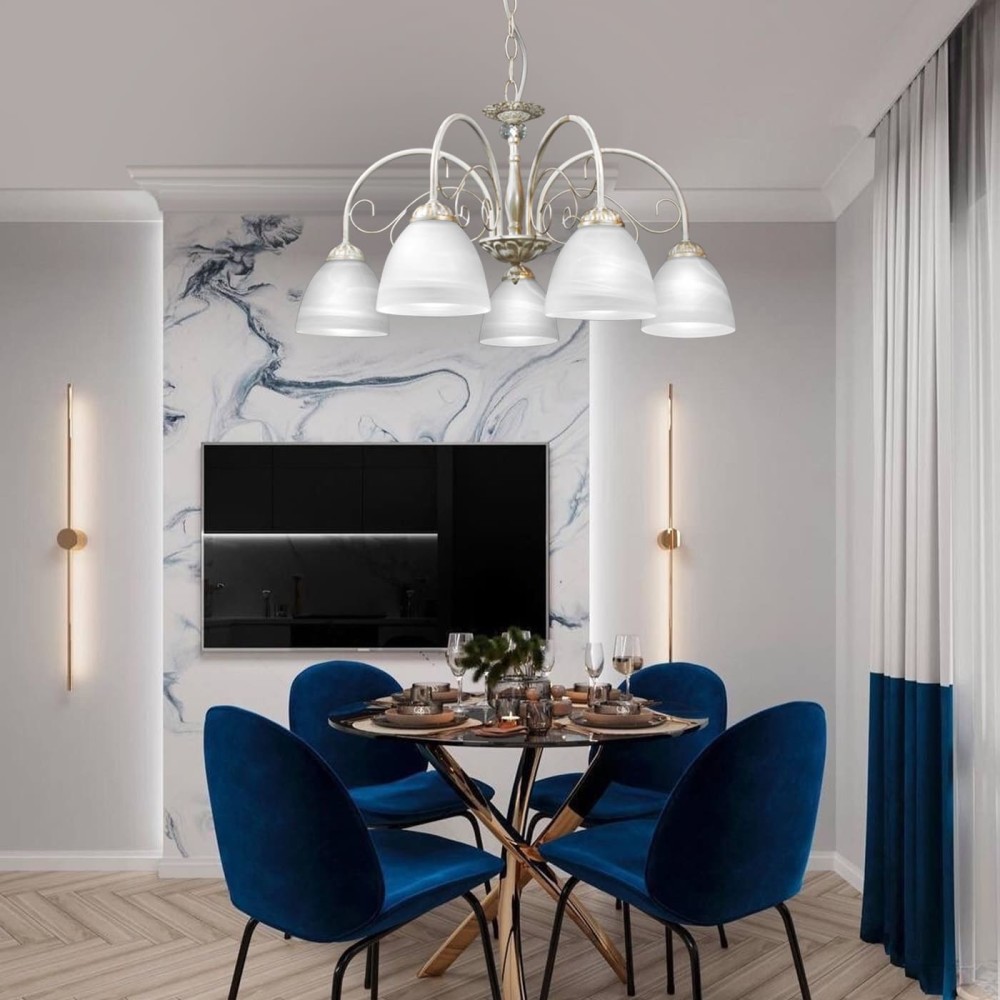 Подвесная люстра S2162 от Petra Svet – Изысканный Классический Декор для Вашего Интерьера Эта роскошная подвесная люстра, разработанная брендом Petra Svet, станет настоящим украшением вашего дома. Сочетая в себе элегантность неоклассики, шарма прованса и безупречного качества, она преобразит любое помещение, создавая атмосферу уюта, тепла и великолепия. Люстра S2162 – это не просто источник света, это инвестиция в стиль и комфорт вашего жилища. Превосходное Освещение и Безупречный Дизайн Люстра S2162 от Petra Svet – это идеальное решение для тех, кто ценит красоту и функциональность. Благодаря пяти плафона, расположенным в элегантном расположении, она обеспечивает равномерное и рассеянное освещение, создавая приятную атмосферу в комнате. Световой поток в 6750 люмен – это оптимальное значение для освещения помещений площадью от 17 до 30 квадратных метров. Вы можете использовать люстру в гостиной, столовой, спальне или кабинете – она будет одинаково эффектно смотреться в любом интерьере. Роскошный Материал и Изысканный Дизайн Люстра выполнена из высококачественного металла, покрытого патиной золота. Такое покрытие придает светильнику благородный и элегантный вид, подчеркивая его роскошный стиль. Металлический каркас прочный и долговечный, а патиновая золотая отделка придает светильнику глубину и текстуру. Материал плафона – стекло, что обеспечивает превосходную светопропускающую способность и долговечность. В этой модели используются хрустальные вставки, которые добавляют блеска и роскоши, отражая свет и создавая завораживающие блики. Технические Характеристики и Преимущества Бренд: Petra Svet – известный российский производитель светотехнической продукции, зарекомендовавший себя как поставщик качественных и надежных светильников. Страна производства: Россия – гарантия качества и соответствия российским стандартам. Тип светильника: Подвесная люстра. Модель: S2162. Материал светильника: Металл с патиной золота. Цвет светильника: Белый с патиной золота. Тип цоколя: Е27 – стандартный цоколь, позволяющий использовать различные типы ламп. Количество ламп: 5. Стиль: Классический, неоклассика, прованс – люстра идеально впишется в интерьеры в различных стилях. Направление рассеивателя: Вниз – обеспечивает направленное освещение, создавая уютную атмосферу. Тип крепления: Крюк – обеспечивает надежное и безопасное крепление люстры к потолку. Размер коробки (H x L x W): 30 x 32 x 31 см – удобна для транспортировки и хранения. Ширина основания: 12 см – обеспечивает устойчивость люстры. Высота: 48-65 см – позволяет регулировать высоту люстры в зависимости от высоты потолка. Напряжение: 220 В – стандартное напряжение для бытовых электроприборов. Площадь освещения: 17-30 м? – оптимальный размер для освещения комнаты. Срок гарантии: 7 лет – подтверждает качество и надежность продукции Petra Svet. Состав комплектации: Светильник, паспорт. Преимущества использования люстры S2162 от Petra Svet: Эффектное Освещение: Благодаря пяти плафона и большому световому потоку, люстра обеспечивает яркое и равномерное освещение, создавая комфортную атмосферу в комнате. Высокое Качество Материалов: Использование высококачественного металла и стекла гарантирует долговечность и надежность светильника. Роскошный Дизайн: Сочетание патиновой золотой отделки, хрустальных вставок и классич